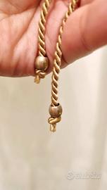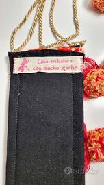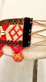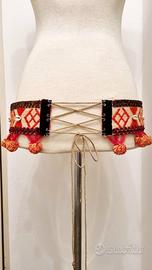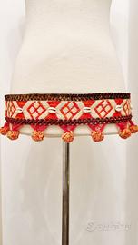Cintura di danza (tribal fusion/ danza del ventre) formata da una passamaneria centrale color beige con disegni arancioni a forma di rombo, passamaneria superiore di paillettes marroni, passamaneria inferiore ondulata colore bordeaux e pom pon mélange arancioni/gialli. Leggermente intelata (perció non é stretch). La fodera interna della cintura é un tessuto simile al jersey. Chiusura regolabile con gancini/occhielli metallici e lungo cordino beige. Ottime condizioni, indossata poche volte. Adatta per classi di danza o anche per look boho. Misura cintura: 6,5 cm x 79 cm. Dimensione pom pon: 2 cm circa