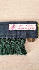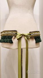 Cintura di danza (tribal fusion/ danza del ventre) formata da una passamaneria color verde scuro con fili ricamati color giallo/oro, parte centrale decorata con perline e parte inferiore con nappine. Leggermente rafforzata con interfodera (si nota nel lato interno della cintura). Non é stretch. Chiusura regolabile con dei lunghi nastri di raso verde. Ottime condizioni, indossata poche volte. Adatta per classi di danza o anche per look boho. Misura cintura: 4 cm x 79 cm. Dimensione nappine: 4 cm circa Lunghezza nastri: 78 cm.