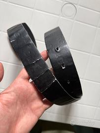 Cintura Dolce & Gabbana con fibbia maxi in metallo dorato con logo D&G in rilievo e scritta "Dolce & Gabbana" ripetuta sul bordo della fibbia. Pezzo iconico dal grande impatto visivo. La cintura presenta segni d'uso sulla parte in pelle, ma la fibbia è in ottimo stato e rimane il punto di forza del pezzo – ideale anche da abbinare a un cinturino nuovo. Taglia: 90
