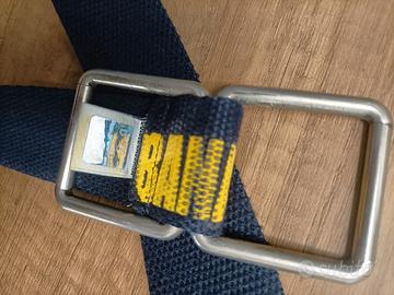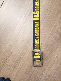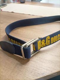 Vendo cintura Dolce & Gabbana in tessuto, fondo blu e scritte in giallo. 95cm. Doppia fibbia originale. Usata, qualche segno di usura sulla scritta (come da foto)