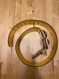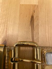 Cintura Dolce & Gabbana molto alta oro , misura unica perchè con buchi, percui regolabile. Unico difetto ha la vernice oro che è venuta un pó via quindi si puo far dare una ripitturata e viene come nuova essendo le parti in metallo oro tenute benissimo, pagata 400