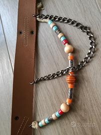 Cintura da donna e ragazza in vera pelle bianca con 2 catenelle laterali: una in metallo e una in spago con perline in metallo, legno e plastica colorate