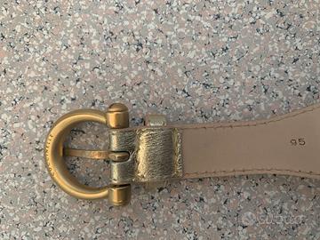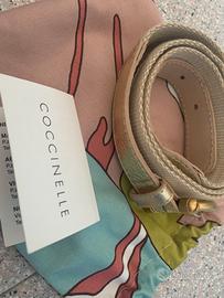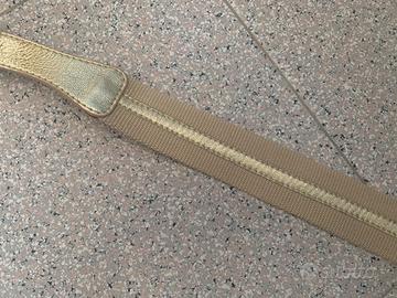 Cintura donna originale Coccinelle. Fibbia oro con firma del brand interna. Cintura in tessuto con dettagli in pelle oro. Ben tenuta, con suo sacchetto originale e cartellino (staccato) Coccinelle.