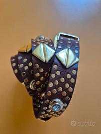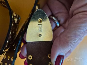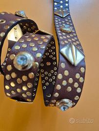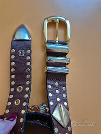 Cintura donna in pelle Mila Schon, colore marrone cuoio con borchie dorate e strass, lunghezza 97 cm. Usata pochissimo in ottime condizioni.