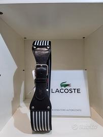 Cintura donna in tessuto di cotone elasticizzato di colore nero e bianco. Tessuto elasticizzato a righe di colore bianco e nero con fibbia in metallo e terminali in pelle con logo Lacoste. Articolo originale made in France taglia 38 francese.