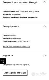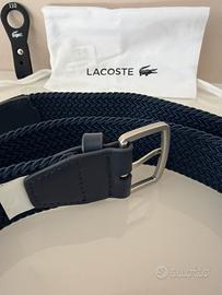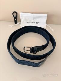 . 110 cm. . Fibbia in metallo con logo inciso. . Passante in pelle con coccodrillo Lacoste in rilievo. . Tessuto intrecciato resistente. . Mai utilizzata. . Colore: blu notte . Con custodia originale e gancio da appendere. . Prova d’acquisto e materiale.