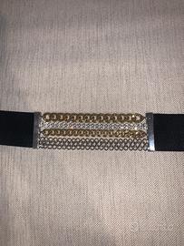Cintura elegante Max Mara composta da catene alternate dorate, argentate e con strass. Misura M ma regolabile, adattabile a qualsiasi fisicità.