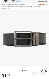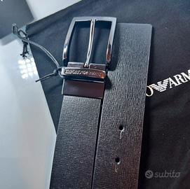 Vendo Cintura NUOVA EMPORIO ARMANI originale con sacchetto. Ne compri 2 al prezzo di una!!! E a meno di altri siti (vedi foto) Design reversibile: 2 cintura in una grazie al meccanismo a rotazione della fibbia, passando da un lato a l’altro in un’attimo! - lato 1 Nero: Pelle soffiano nero che la rende resistente a i graffi dandole un aspetto più casual-sportivo - Lato 2: nero: Pelle liscia, ideale per un look elegante Fibbia: in metallo con finitura lucida e con scritta “Emporio Armani” incisa elegantemente sul passante metallico della fibbia. Lunghezza 125cm, larghezza cintura 3,5cm Sacchetto incluso!