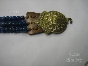 cintura etnica in cuoio e con perle di vetro colore turchese con finiture e fibbia in metallo dorato, lunghezza aperta totale cm.78 altezza cm.4,5 spessore cm.1 vendo a e.75, ritiro e trasporto a carico del compratore oppure posso spedire con pacco postale in contrassegno costo 10 euro