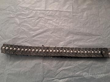 Cintura elastica con maglie in metallo, impreziosita da fibbia smaltata a forma di farfalla con strass. Dimensioni cintura allacciata cm 36, aperta, con esclusione della fibbia cm 71. Ottime condizioni, no reso.