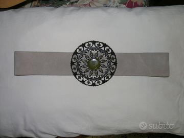 cintura in pelle scamosciata color ghiaccio, stile dark elisabettiano, firmata, datata quarantennale ma non indossata