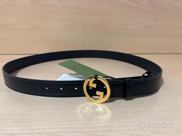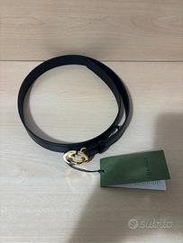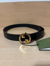 Cintura Gucci Blondie in pelle di vitello nera con l'iconica fibbia Incrocio GG in metallo dorato.