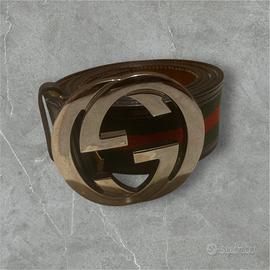 Cintura Gucci originale con iconica fibbia GG in metallo. Colore verde e rosso con interno marrone, in buone condizioni.