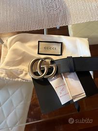 Salve, vendo cintura Gucci Doppia G con fibbia in argento satinato. Colore cuoio blu, misura 90cm (da 85 a 95cm) larghezza 3,6cm.