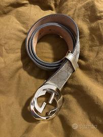 Cintura Gucci originale in tela monogram con motivo GG all-over. Colore argento con logo GG, rifinita con bordi e passante in pelle marrone liscia con cuciture tono su tono. La fibbia è l’iconica GG interlocking in metallo argentato lucido, grande. Modello elegante e versatile. Struttura resistente, materiali di qualità e finiture curate nei dettagli.