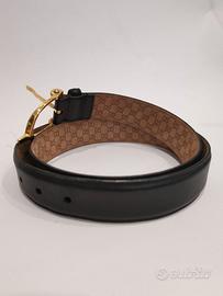 Cintura Gucci originale, modello in pelle di vitello nera con interno in pelle stampa Guccissima e fibbia a forma di staffa in metallo dorato.