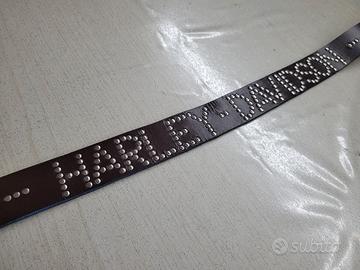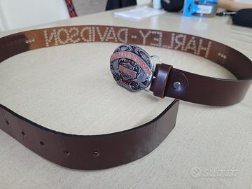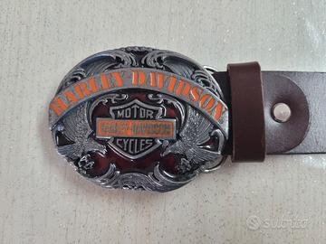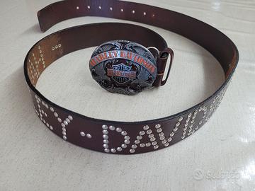 Bellissima cintura Harley Davidson in cuoio marrone con fibbia in metallo con inserti smaltati. La cintura presenta la scritta harley davidson realizzata artigianalmente con borchie in metallo ed è in ottime condizioni.