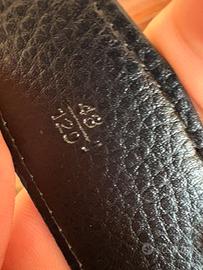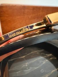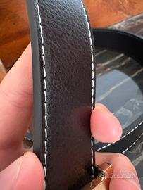 cintura hermes nera con fibbia color oro, scritta hermes sotto al simbolo e cuciture bianche nella struttura di colore nero. la pelle nella realtà ha un ottimo colore nero, nelle foto ha un leggero riflesso.