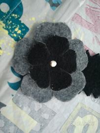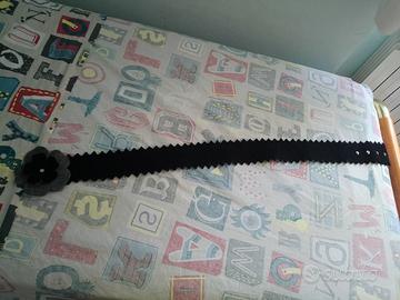 Cintura nera e grigia in lana cotta, allacciatura con bottoni a pressione con 3 diverse possibilità di chiusura. Ingentilita da fiore in lana cotta posto all' inizio con dietro 2 bottoni. Lunghezza 103 cm. Usata ma tenuta benissimo!!!