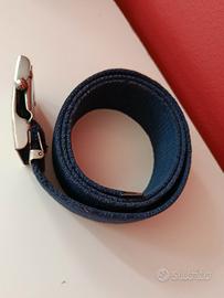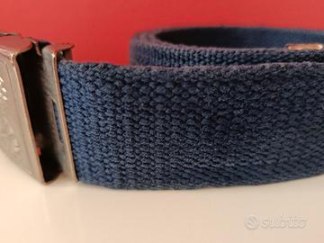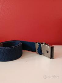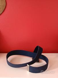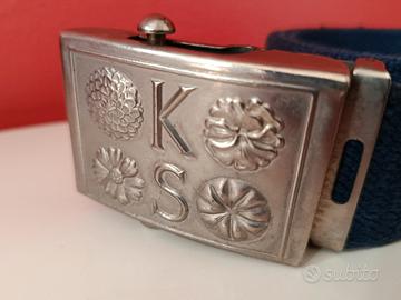 cintura in cotone blu scuro vintage originale firmata Ken Scott. La fibbia in metallo argentato lucido presenta l'iconico logo "KS" con corona, simbolo del brand. Accessorio perfetto per collezionisti del vintage italiano di qualità o per chi apprezza lo stile massimalista e artistico di Ken Scott. Condizioni vintage molto buone.