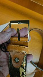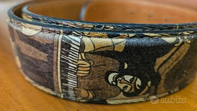 Cintura Le Coté originale in pelle con stampa artistica ispirata alle opere del designer Antonio Cotecchia. Design particolare e ricercato, con fibbia in metallo satinato e dettagli in cuoio.
