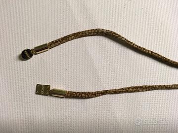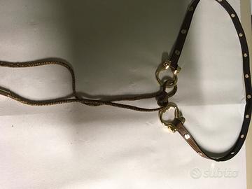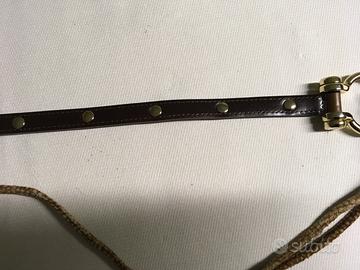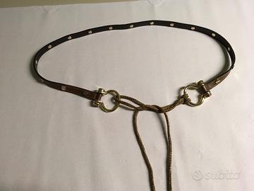 Cintura donna alta 1 cm in pelle marrone con la particolarita’ di avere su tutta La lunghezza (cm 82 ) piccole placchette dorate firmate borbonese Ai lati della cintura due originali fibbie dorate che uniscono con laccetti di camoscio lunghi 48 cm in iconico borbonese i due lati, lunhezza comprese le fibbie cm 91