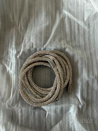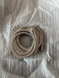 cinta MAI indossata. ancora nella sua scatola d’origine con sacchetta propria. la puoi annodare in vita su un vestito, indossare nei passanti dei jeans o come collana, la cintura tubolare di strass aggiungerà al look la giusta dose di glamour!!! Design tubolare Micro strass a pavé Parti terminali in metallo lunghezza: 200 cm