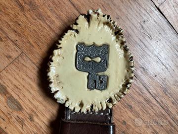 Stato: L'accessorio è in buone condizioni estetiche generali. Nota bene: l'ardiglione (il perno metallico) è stato oggetto di una riparazione artigianale per garantirne la funzionalità. Il segno del fissaggio è visibile solo sul retro della fibbia e non pregiudica l'estetica una volta indossata.
