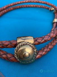 Cintura in pelle intrecciata con ornamentinin ottobe e chiusura a uncino. Cm 80