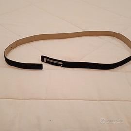 Cintura da donna sottiledi colore nero, scamosciata, con una fibbia minimalista in metallo argentato.