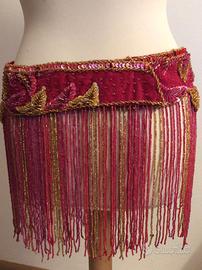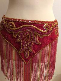 cintura professionale per abito danza orientale, manifattura di qualità ottima e morbida, colore rosso scuro ed oro, con applicazioni decoro ricco di perline, con frange molto lunghe di perline di vetro.