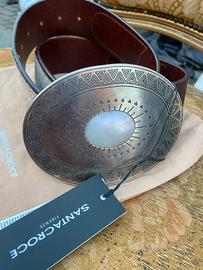Cintura in pelle con lavorazione scamosciata e applicazioni, fibbia in metallo con pietra madreperla. Misura 90cm,