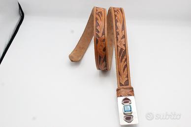 cintura unisex in cuoio con bassorilievo fatto a mano e con fibia in argento gr 50 con 2 pietre semipreziose Corniola e un Topazio Azzurro PEZZO UNICO