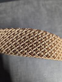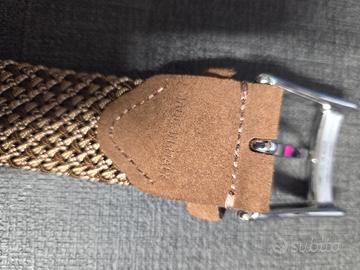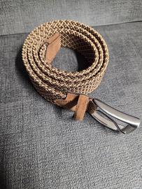 Cintura Boggi intrecciata beige in ottime condizioni, con fibbia metallica incisa e dettagli in pelle. Misura della cintura totale 116 cm Modello elastico e molto comodo, perfetto per outfit casual o eleganti. Materiali di qualità e intreccio resistente. Lunghezza standard uomo. Composizioni: Elastan Acrilico Viscosa
