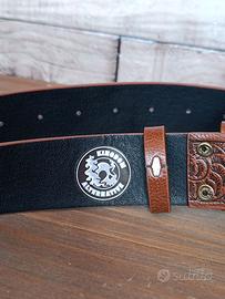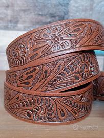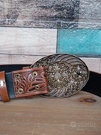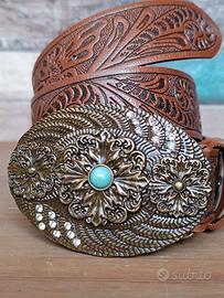Elegante cintura in ecopelle marrone di ottima qualità con fibbia dorata e dettagli in rilievo. - Fibbia grande 10x7 cm con decorazioni floreali - Pietra centrale color turchese. - Cristalli scintillanti sulla fibbia. - Motivi floreali incisi sulla cintura, lunghezza 110 cm, altezza 4 cm. Mai usata, perfetta per serate country western cowgirl boho style