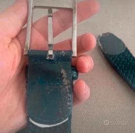 Blu intrecciata, senza marchio, la lunghezze è di 110 cm. La misura del passante è di 3 cm.