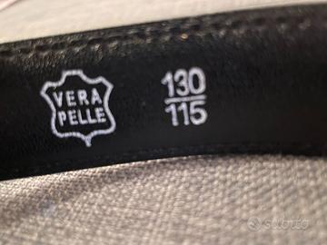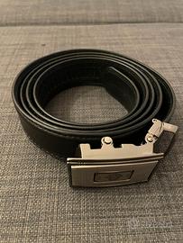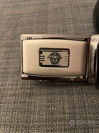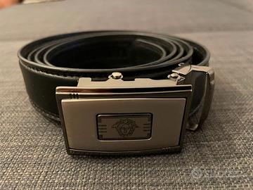 Cintura originale Versace da uomo in vera pelle, colore nero, lunghezza 130 cm (taglia 115). Fibbia automatica in metallo con iconica testa di Medusa al centro.