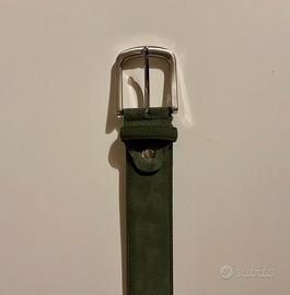 Come da titolo vendo cintura in vera pelle scamosciata da uomo colore verde come da foto lunghezza 95 cm altezza 4cm. Nuova mai indossata causa errore taglia.