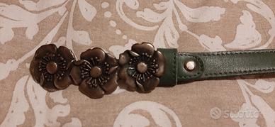 Bellissima cintura in pelle / (similpelle ??) Lunga 100 cm ,intrecciata ,con fibbia in metallo a forma di fiori ,in ottime condizioni percdhé praticamente mai utilizzata ! Accorciabile a piacere nella parte iniziale senza bisogno di fare nuovi fori .