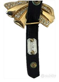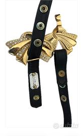 Splendida e rara cintura vintage firmata Gloria Santandrea, in pelle nera e fiocco dorato con cristalli , un vero gioiello del design italiano anni '80/'90. Questo accessorio è perfetto per chi ama lo stile "maximalist" o vuole aggiungere un tocco di eleganza retrò a un abito o a un cappotto. Dettagli principali: • Brand: Gloria Santandrea (Santandrea Milano). • Materiale: Vera pelle nera di alta qualità, morbida e resistente. • Fibbia: Grande fiocco scultoreo in metallo dorato, impreziosito da file di cristalli/strass luminosi. • Chiusura: Regolabile tramite pratici bottoni a pressione (automatici) Produzione: Made in Italy. Condizioni: L'articolo è in buone condizioni vintage. La pelle è ben conservata
