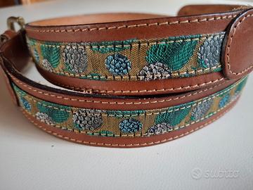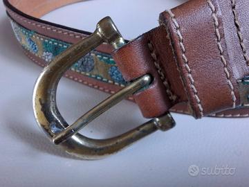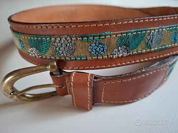 Cintura in vero cuoio con rifiniture in tessuto e fibbia in ottone. Lunghezza all'ultimo forellino 80 cm. All'interno la marca e la misura.