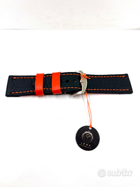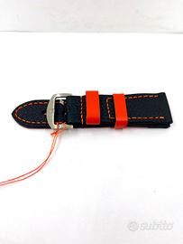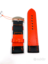 Cinturino realizzato e cucito totalmente a mano. Pelle nera esternamente, pelle arancio internamente , cuciture arancione, fibbia nera da 24 mm. Spedizione immediata Contattami per altri modelli, misure e colori. Anche per Apple Watch