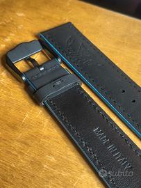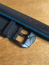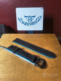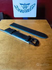 Cinturino nuovo originale Squale, nero in Hydroleather nera con profilo blu, con ardiglione in acciaio inox brunito nero pvd, originale con logo Squale. Compatibile con: 1521 1545 T-183 Drass e tutti gli altri modelli vintage da 20 mm. Questo cinturino nero opaco con finitura blu brillante a contrasto è ideato per resistere alle immersioni mantenendo un design elegantemente sportivo da cinturino in pelle. Cucito a mano, originale Squale, made in Italy.
