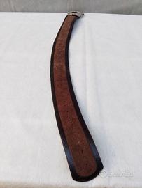 Cinturone rigido in pelle intagliata a ricreare immagini floreali e grande borchia rotonda in metallo lavorato e con tanti strass/ cristalli, frutto di elaborata lavorazione artigianale per un risultato ad effetto: è bicolore, con due diverse tonalità di marrone frontalmente, nera al rovescio, con borchia color argento e cristalli trasparenti. Ha lunghezza di circa 102 cm, larghezza di 8 cm e peso di 417 g. Si tratta di grande cinturone da abbinare secondo i gusti personali al fine di dare un tocco di unicità senza tempo. Le condizioni della cintura sono buone: unici difetti due strass mancanti ma facilmente sostituibili e piccolo difetto del cuoio in un bordo. Manca la confezione originale ma confezionerò io in modo adeguato e spedirò con opzione " Tutto Subito". E' possibile il ritiro sul posto