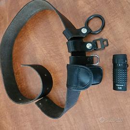 vendo cinturone in cuoio nero, marca “la selleria”, con 4 accessori (n. 1 portasfollagente, n. 1 gancio per casco, 1 gancio, 1 monocolo 7x18 decathlon). dimensioni in centimetri: lunghezza 110, altezza 5. ottimamente tenuto, poco utilizzato. euro 30.