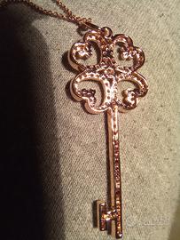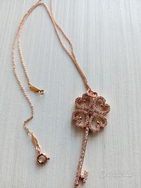Vendo ciondolo in acciaio dorato rosa con zirconi a forma di chiave a quadrifoglio con zirconi 🍀 🔑. Nuovo mai indossato . Possibilità anche in colore argento.