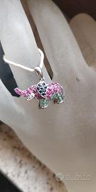 Ciondolo in argento sterling 925 nikel free elefantino portafortuna con rubini, smeraldi, zaffiri e topazi.