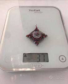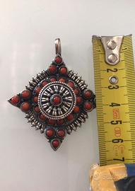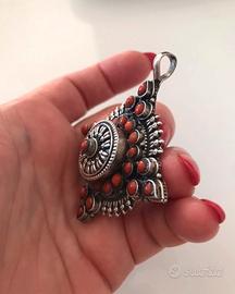 Ciondolo con gancio per pendente argento indiano925 , peso 37gr con pietre pasta corallo misura cm 6,5x 6 cm circa .Usato e in ottime condizioni