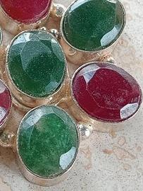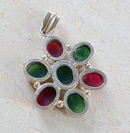 Vendo causa inutilizzo ciondolo in argento sterling e radice di rubino e smeraldo, lunghezza 37.2mm e altezza 7.5mm, condizioni come nuovo, astenersi perditempo.
