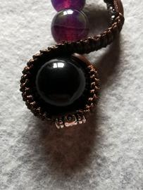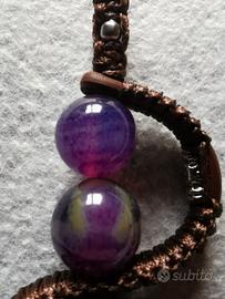 Il pezzo unico combina il calore del cuoio alla bellezza naturale delle pietre dure (Agata viola e Onice nero), legate da un accurato intreccio in cordino cerato.